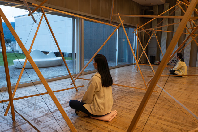 半球状・共鳴テンセグリティ®︎直径4m内部での瞑想2 スタジオ外部のテラス(雨天では内部に移動)