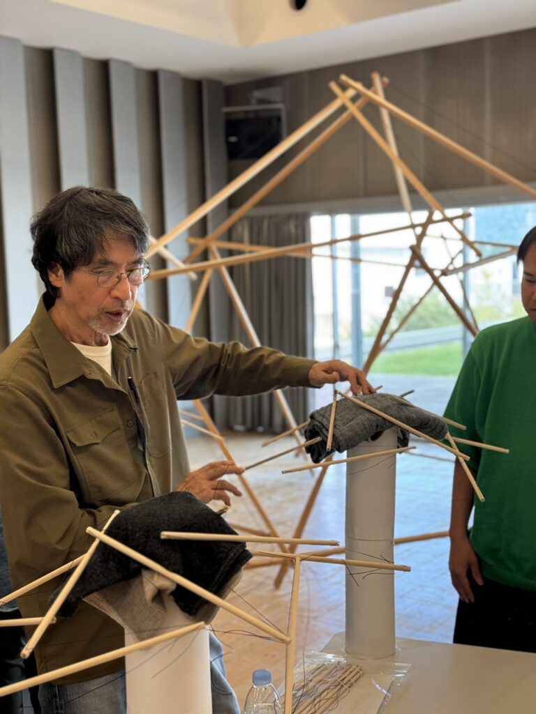 この遠隔プログラムによって、より個人的でリアルなテンセグリティ体験ができる。張力が加わる毎に変容する構造形成時の、直接手から伝わってくる統合されていく連続的なテンションネットワーク感覚は、幾何学だけからは捉えられないシナジェティクスな生命感覚である。