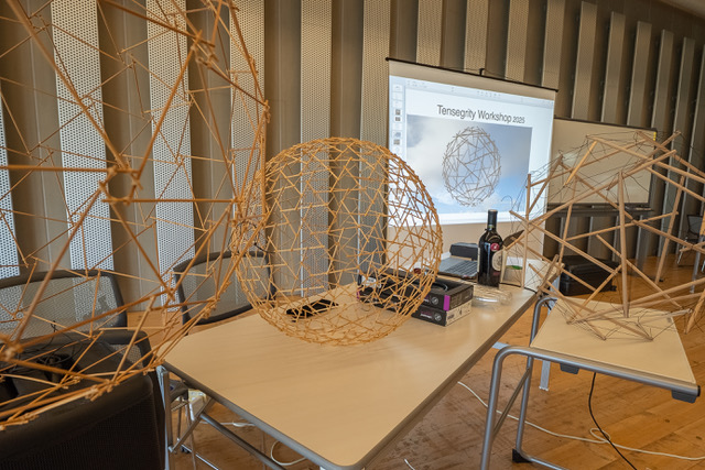 「共鳴テンセグリティ・ワークショップ」では、シナジェティクス研究所が開発したこの共鳴するテンセグリティモデルと同一タイプの、本質的なテンセグリティ教材を使用し、動くテンセグリティの原理を手から学ぶことができる。